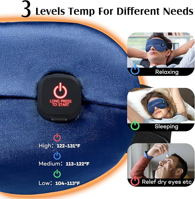 - Three Temperature Settings Fit All Your Needs: YFONG warm eye compress mask offers 3 temps. Whether relieve dry eyes or experience a relaxing sleep, you can always find the perfect temperature. Choose the gentle low-heat (green light: 104℉-113℉) and medium heat (blue light:113-122) for a warm and relaxing sleep or the high heat (red light: 122℉-131℉) for dry eyes. It will automatically shut off after 30 minutes of heating.