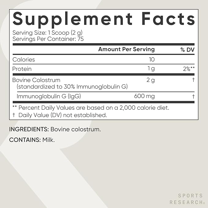- WHY CHOOSE SPORTS RESEARCH? At Sports Research, we’ve been family-owned since 1980, driven by a passion for fitness, wellness, and quality products. Our Colostrum Powder is non-GMO, gluten-free & Informed Sport third-party tested safe for athletes, reflecting our commitment to purity and excellence.