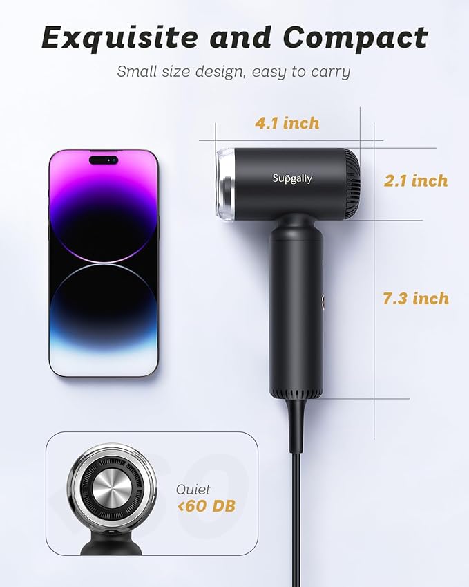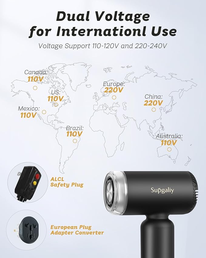 - 【Dual voltage suitable for any country】SUPGALIY portable hair dryer adopts intelligent dual voltage technology, whether in the US or traveling internationally in Europe, which can detect local voltage and automatically adjust to the correct voltage
