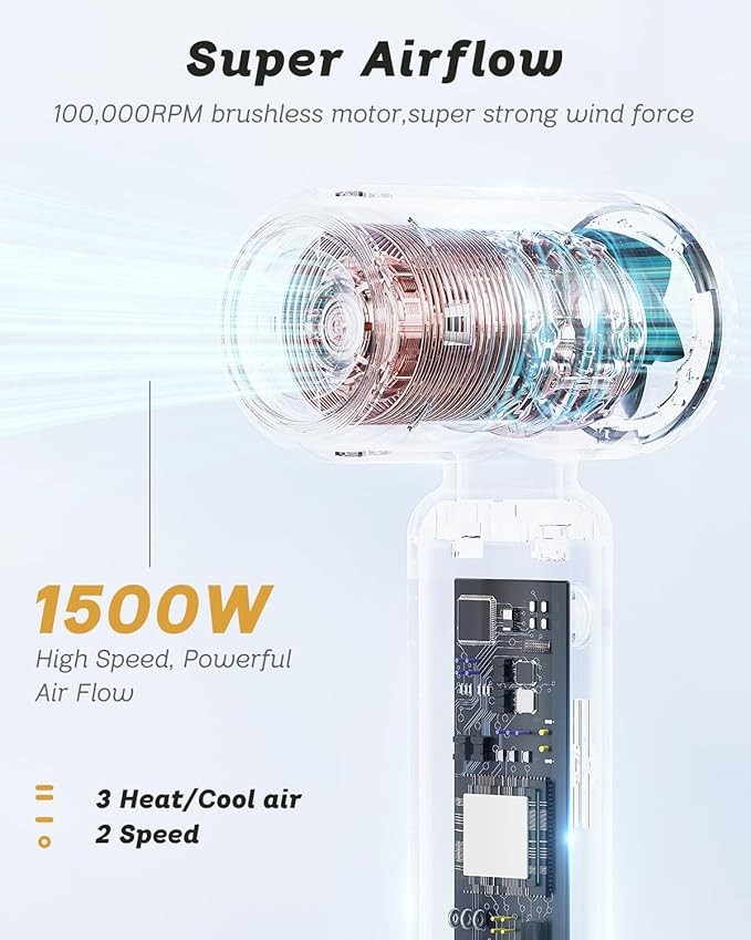 - 【Small but Faster Drying】High-speed hair dryer is equipped with professional brushless motor 110,000RPM, and wind speed reaches 26m/s. 1500W blower hair dryer upgraded high powered to provide powerful airflow speed to fast dry and reduce damage hair