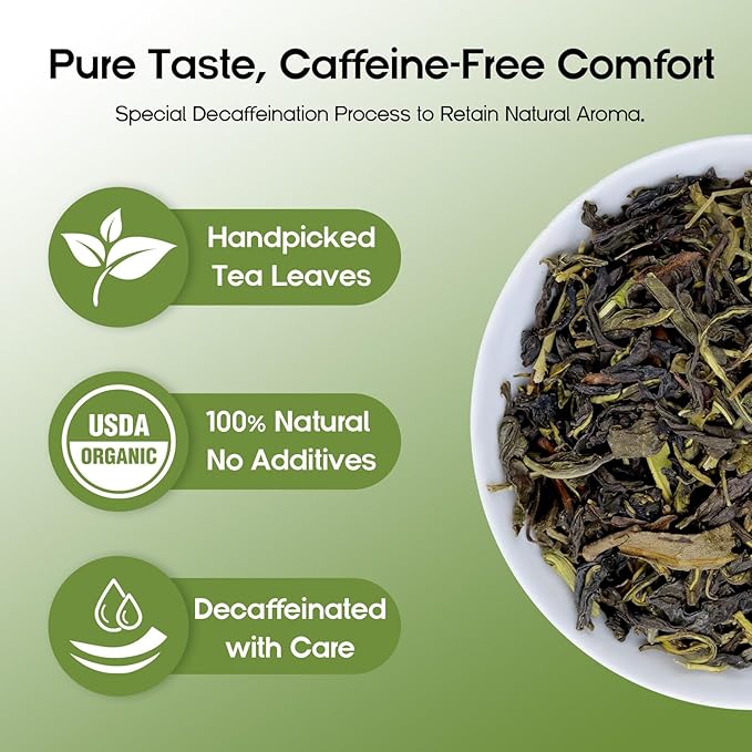 - EASY TO MAKE, HOT OR ICED: Experience the pure essence of green tea without the caffeine. Our tea undergoes a gentle CO2 decaffeination process to preserve its rich flavor and antioxidant benefits. Whether you prefer a steaming brew or a refreshing iced drink, this tea caters to all preferences