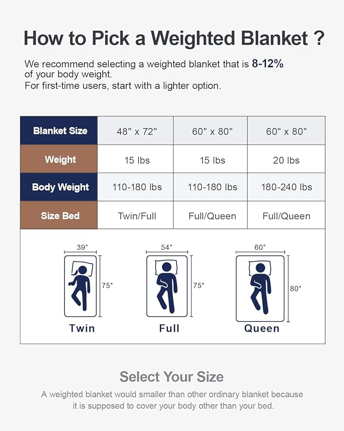 - Weight/Size Guide: Choose 10% of body weight for the ideal blanket weight. If you're unsure or between two weights, go with the lighter option. Reference the size chart to select the proper size. This 48" x 72" weighted blanket is as big as the top of your twin-size mattress (*WITHOUT OVERHANGING)
