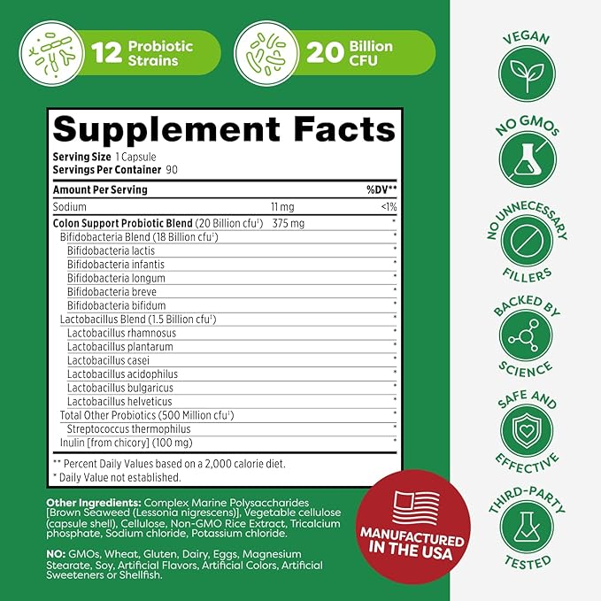 - COLON CARE SUPPLEMENTS: Safeguard your colon and gut health and align with healthier living goals with our Colon Support Supplements! Formulated to restore and support the colon's unique microbiome and featuring a 12-strain blend for optimal potency including prebiotics, this daily supplement may also offer support for occasional gas and bloating so that you can enjoy a delicious meal or a night out with friends and still feel comfortable and regular **Product is the same as the blister pack** Same great product you love, with a new look. 90 Serving size 1 capsule, servings per bottle