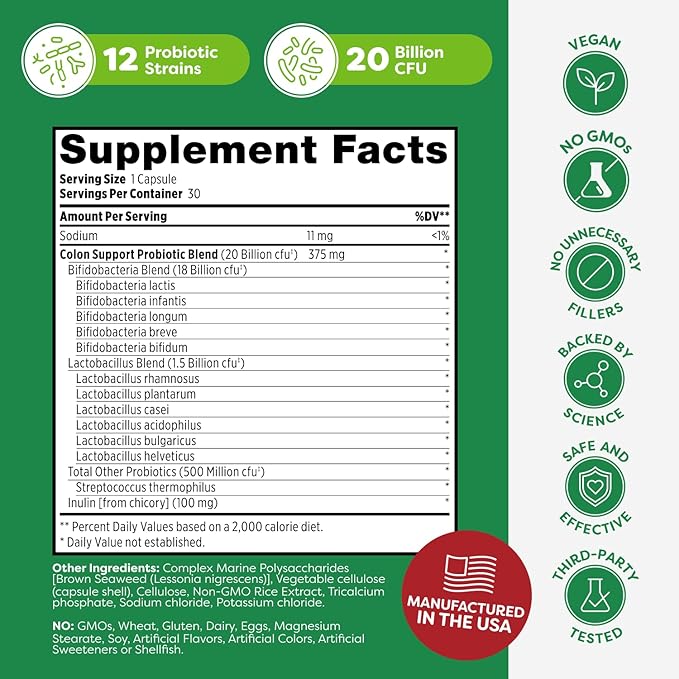 - COLON CARE SUPPLEMENTS: Safeguard your colon and gut health and align with healthier living goals with our Colon Support Supplements! Formulated to restore and support the colon's unique microbiome and featuring a 12-strain blend for optimal potency including prebiotics, this daily supplement may also offer support for occasional gas and bloating so that you can enjoy a delicious meal or a night out with friends and still feel comfortable and regular **Product is the same as the blister pack** Same great product you love, with a new look. Serving size 1 capsule, 30 servings per bottle