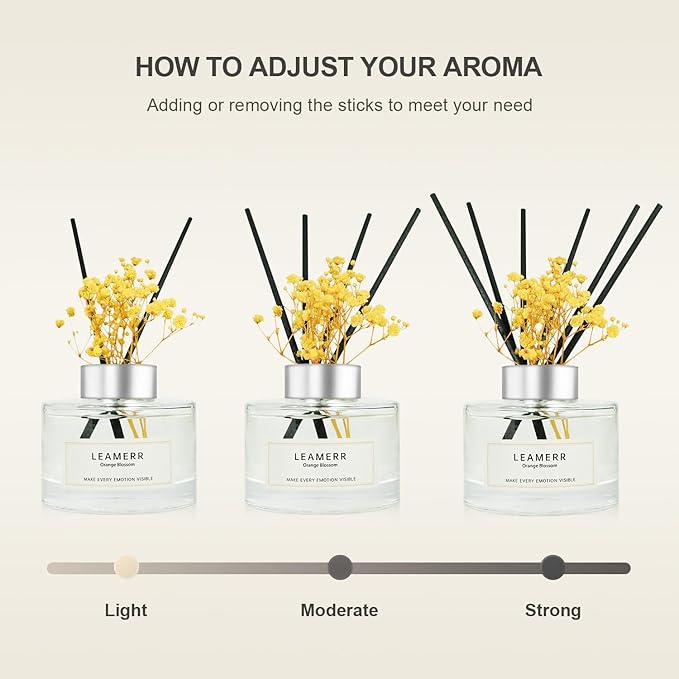 - Fragrant Ambiance: This reed diffuser emits a captivating orange blossom aroma to fill your living space with a refreshing, uplifting fragrance.