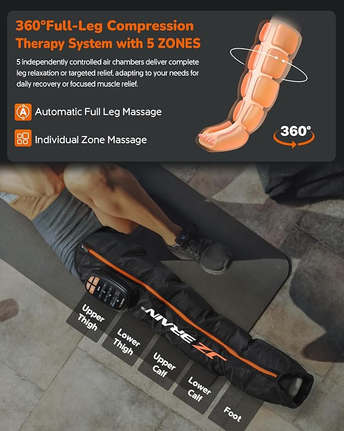 - 【360° Full-Leg Compression for Targeted Relief】Featuring 5 air chambers, this leg massager delivers 360° compression from feet to thighs, effectively reducing swelling and improving blood flow. Perfect for anyone needing deep muscle relaxation or focused recovery after intense activities.