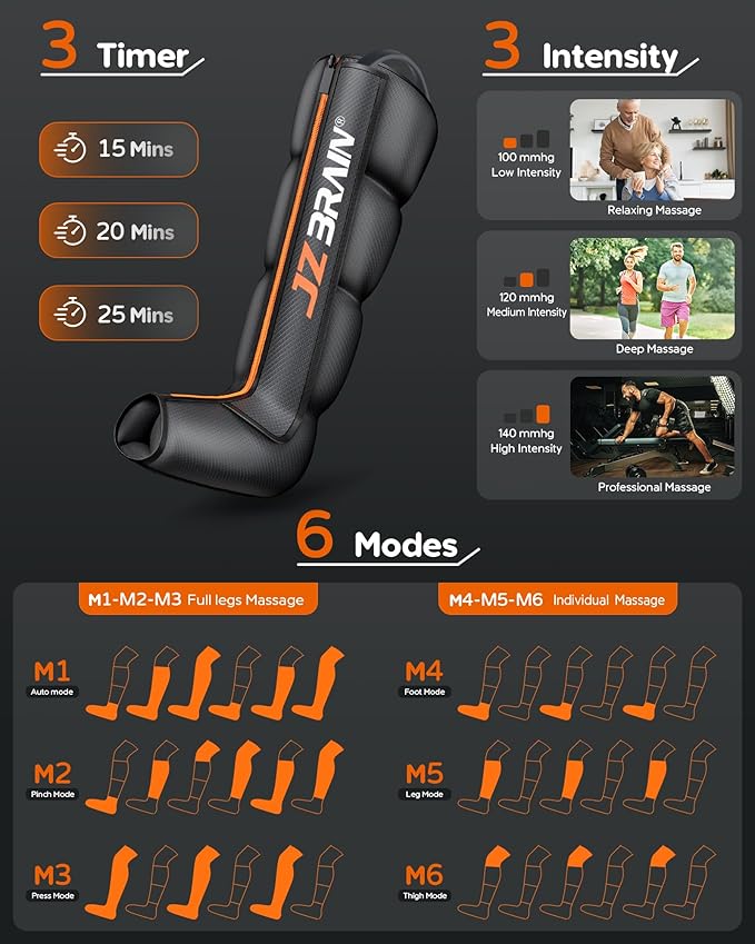 - 【Adjustable Recovery Modes & Smart Timing】Personalize your massage with 6 compression modes, 6 intensity levels, and 3 timer options (15, 20, 25 minutes). Designed for gradual relief with consistent use, helping you unwind, refresh, and recover from daily fatigue.