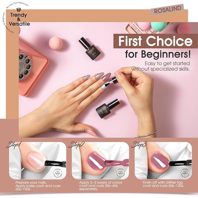 - CLASSIC PINK PURPLE GEL POLISH: ROSALIND gel nail polish includes 12 white pink silver brown colors(Mini bottles, 5ml/0.17fl.oz). Each bottle of gel nail polish is 5.6cm (2.2in) high and 2.7cm (1.06in) long. The small bottle is easy to store and carry when going out