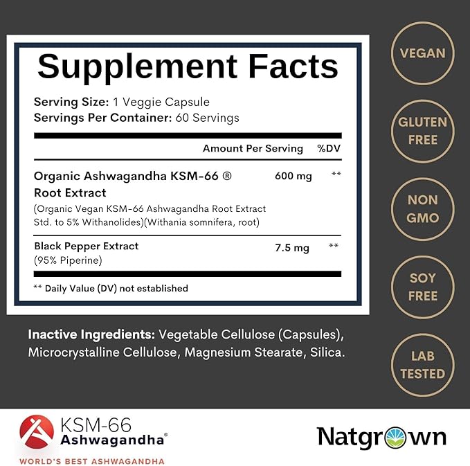 Natgrown Ashwagandha KSM 66 Supplement 600 mg - Stress, Mood, & Athletic Support - Organic KSM66 Root Extract with 5% Withanolides - Vegan Capsules - 60 Count
