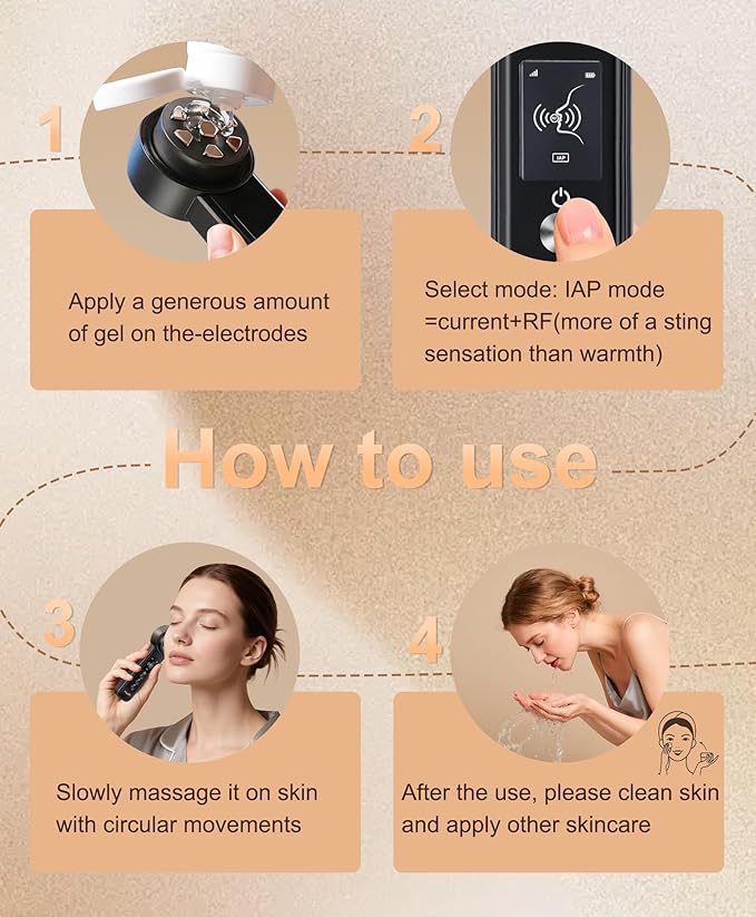 - Smart Skincare System: Heat Opens, Cold Locks, RF Rebuilds, Current-contours. Morning Routine: Cooling Mode - Ice-roller effect to depuff eyes/chin. Current-sculpts jawline/neck-contour, Vibration - Stimulate-microcirculation before makeup. Night Routine: IAP mode: RF+Current technology - Nightly "collagen remodeling" during sleep. Heating Mode - promotes absorption of serums 3X deeper than hands. You can use Vibration mode at the same time with other mode to enhance the results