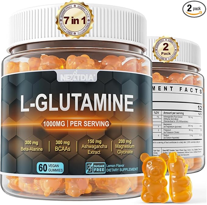 L-Glutamine 1000mg Gummies for Women & Men| with Beta-Alanine, BCAAs, Magnesium Glycinate, Potassium & Ashwagandha | Vegan | Sugar-Free & Extra-Chewy | 120 Counts