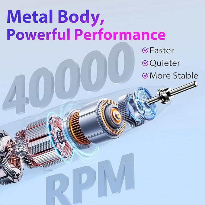 - 【Superior Performance & High RPM Motor】This nail drill professional is equipped with a high speed brushless motor, powerful 40,000 RPM motor, providing efficient drilling and polishing ability, ensuring polishing efficiency and precision, can quickly finish nail trimming, sanding and polishing work, all in a short period of time, improving efficiency for a fast and stable nail experience.