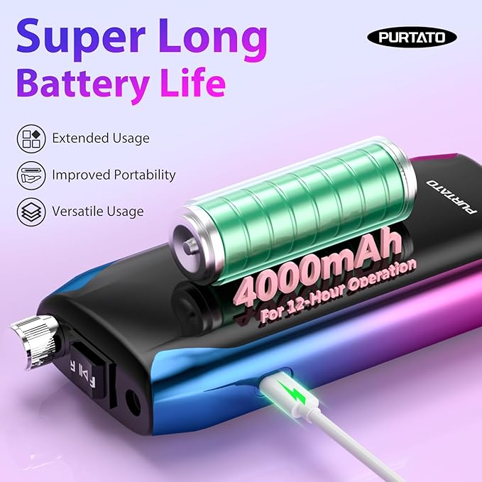 - 【Extra Long Battery Life & Low Noise】Equipped with a 4000mAh battery, this electric nail file machine can be used continuously for 12 hours, providing an efficient experience for both home users and professional manicurists. To minimize discomfort during use, the cordless nail E file with low-noise design that ensures peaceful environment while enjoying your manicure and reduces heat generation. For nail salons, greatly improve work efficiency.