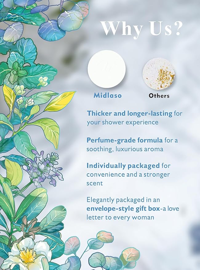 - 🩵THE GIFT SHE’LL ADORE - Whether it’s for Christmas, birthdays, or just a little “thinking of you” surprise, Midlaso shower steamer are the gift that says, “You deserve a moment of peace.” Wrapped in love, they are a thoughtful way to share the gift of self-care with the women in your life.