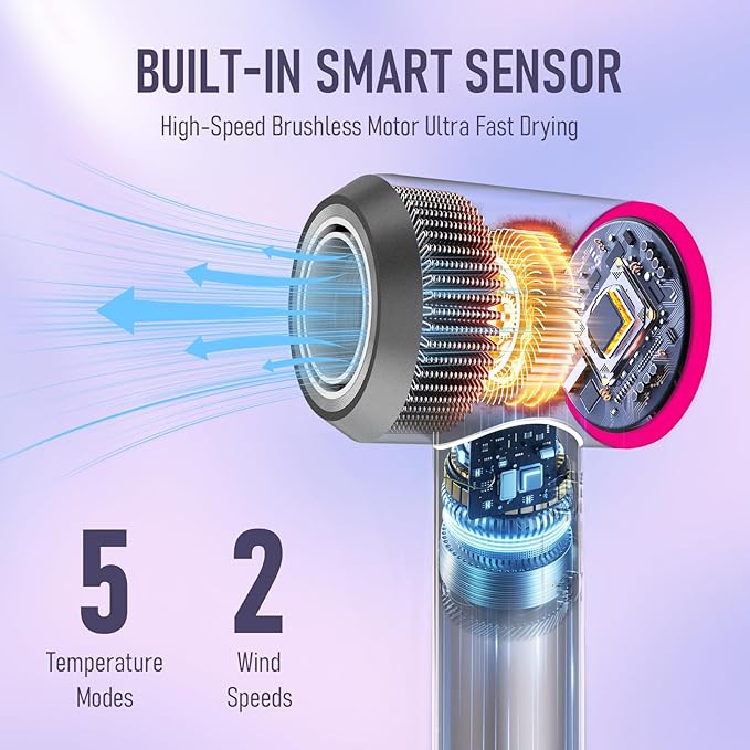 - 【Intelligent Temperature Control System】This hairdryer takes control with 5 temperature settings, 2 airflow speeds .It is equipped with an intelligent temperature control system,which can accurately control the airflow and prevent the risk of hair damage from high heat.