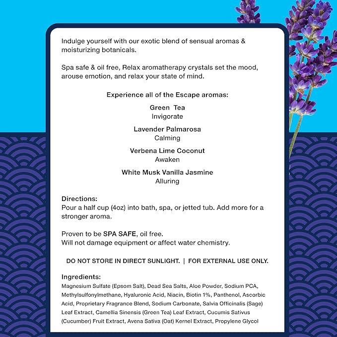 - FORMULATED FOR SPA SYSTEMS: Designed with care for use in hot tubs, Jacuzzis, and whirlpool setups, this blend won’t disrupt water chemistry, cause discoloration or leave behind residue—just a clean luxurious soak every time.