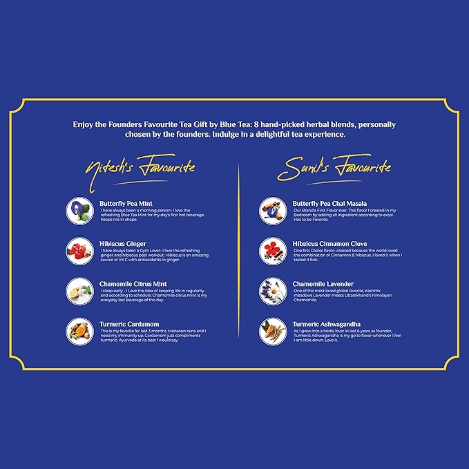 - ASSORTMENT PACK: The gift hamper contains 8 flavours of herbal teas with 5 tea bags each. The flavors are:- Butterfly Pea Mint, Hibiscus Ginger, Chamomile Citrus Mint, Turmeric Cardamom, Butterfly Pea Chai Masala, Hibiscus Cinnamon Clove, Chamomile Lavender, and Turmeric Ashwagandha. Every flavour comes with their unique health benefits. Butterfly Pea supports , Hibiscus boosts collagen for glowing skin, Chamomile soothes for restful sleep, and Turmeric strengthens immunity.