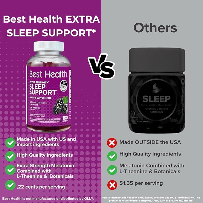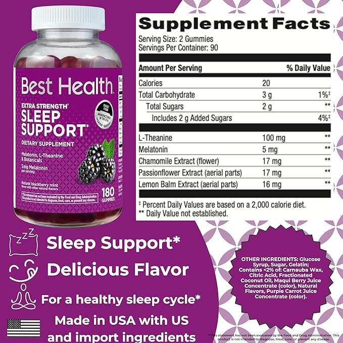 - BEST HEALTH SLEEP SUPPORT* GUMMIES: Enjoy our Sleep Support Gummies, with melatonin, L-Theanine and botanicals*! Drift off into a deep sleep with these sleep support gummies*