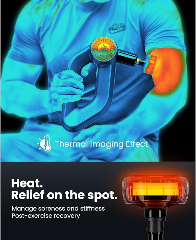 - Heated Massage Gun for Post-Workout Recovery: The D6 Pro Plus massage gun, featuring a heated massage head, delivers a more efficient post-workout recovery program. The combination of deep muscle percussion and heat therapy promotes rapid blood circulation, effectively releasing muscle tension and fatigue. Whether after intense training or prolonged sitting, it provides targeted relief for soreness, tension, and stiffness, helping to prevent and treat muscle injuries.
