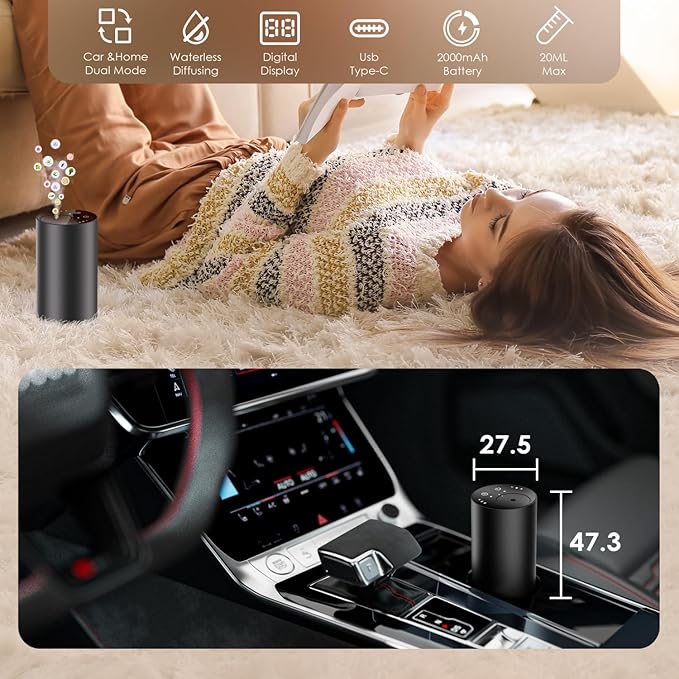- Wide Coverage & Compact and Efficient: The Diffuser for Essential Oils can cover an area of up to 800 sq. ft and operates efficiently in large spaces. It effectively eliminates and masks unpleasant odors in areas such as pet rooms and bathrooms. Note: Please do not turn the Car Air Freshener Diffuser upside down to avoid leakage; this design feature enhances fragrance evaporation.