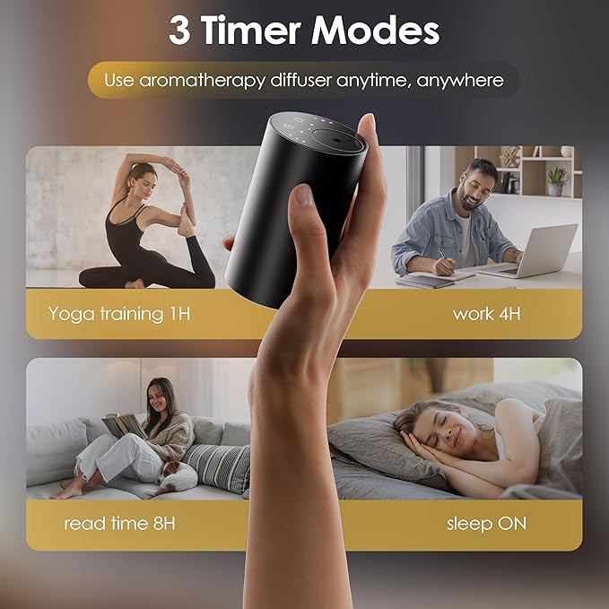 Waterless Essential Oil Diffuser, Portable Aromatherapy Diffuser, Mini Scent Machine, Battery Operated, 1/4/8-Hour Timer, 20ml Capacity, 3 Mist Levels for Home, Car, Room Office,No included oil(Black)