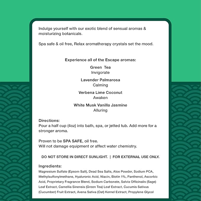 - GREEN TEA AROMA – A clean, uplifting scent to enhance your spa experience. Adds a subtle aromatic note to your soak, great for hot tubs, baths, or Jacuzzis.