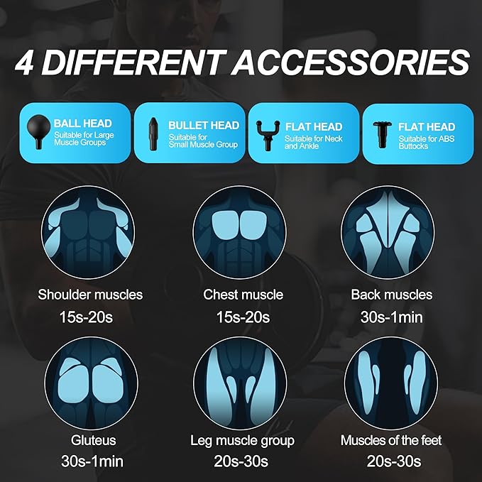 - 【Pressure Sensing System】 Intelligent pressure sensing system, when you use the mini muscle massage gun, you only need to press lightly to enjoy the high vibration frequency. With 4 replaceable massage heads, it can more effectively relieve deep muscle discomfort, which suits athletes and people who love fitness.