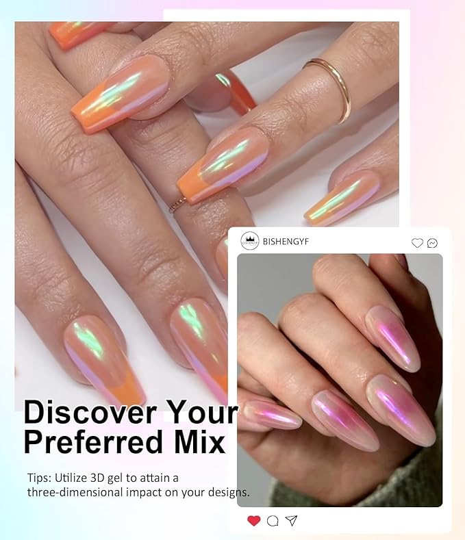 - 3D Nail Gel & Chrome Powder Kit: BISHENGYF upgraded 3D nail art sculpting gel kit include 15g clear nail sculpting gel, mermaid white green purple and pink chrome powders, and sponge sticks. Friendly for nail beginners and nail lovers, allows nail art beginners to create stunning nails at home and DIY enthusiasts for 3D gel nail art sculpture.
