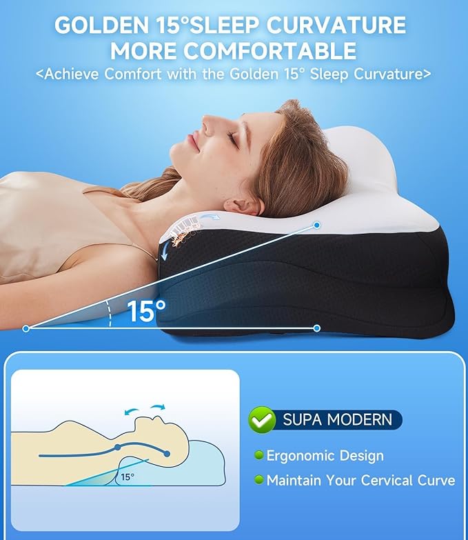 SUPA MODERN Cooling Cervical Neck Pillow for Sleeping, Contour Side Sleeper Pillow for Adults, Ergonomic Memory Foam Orthopedic Neck Pain Relief, Stomach Sleeping with Luxury Cool Cover