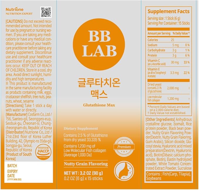 BB LAB Glutathione Max Powder Stick Supplement, Korea Glutathione, Low Molecular Fish Collagen for Woman, Vitamin C, Fast Absorption, Antioxidant, Anti-Aging