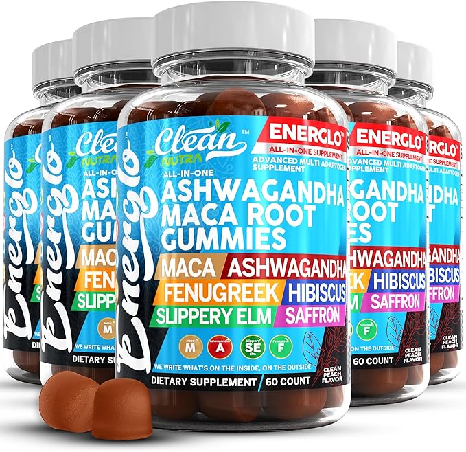 Ashwagandha Maca Root Gummies with Fenugreek Hibiscus Slippery Elm Saffron Extract & Beta Carotene | Peach Flavor Vegan Gummy Vitamins Adaptogen Cortisol Supplement Energlo by Clean Nutra (5)