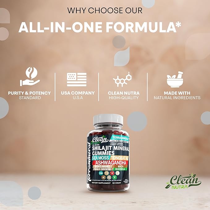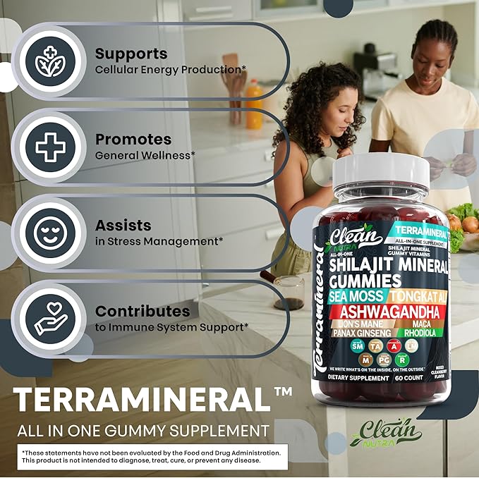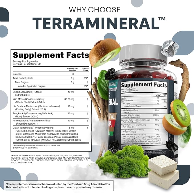 - Ashwagandha Gummies: Terramineral all in one supplement combines the benefits of ancient remedies like irish sea moss gummies, shilajit for men, tongkat ali powder, and ashwagandha with modern herbs such as lions mane extract, maca root powder, ginseng root, rhodiola supplement, and cordyceps gummies, creating a formula that nourishes the body. Shilajit capsules, lions mane gummies for adults, and tongkat ali for men are key ingredients that promotes cellular health and support with stamina.