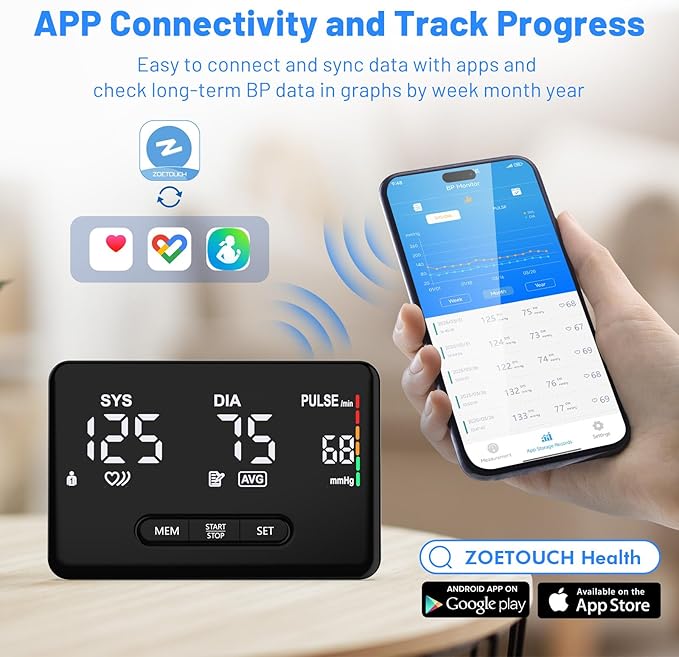 - Smart Bluetooth BP Machine:Four simple steps to connect the home blood pressure monitor with ZOETOUCH Health APP and store data via Bluetooth; It's very easy for elderly as well. It works with iOS and Android devices and allow you to sync data with fitness app Google Fit, Samsung Health,Apple Health through our app