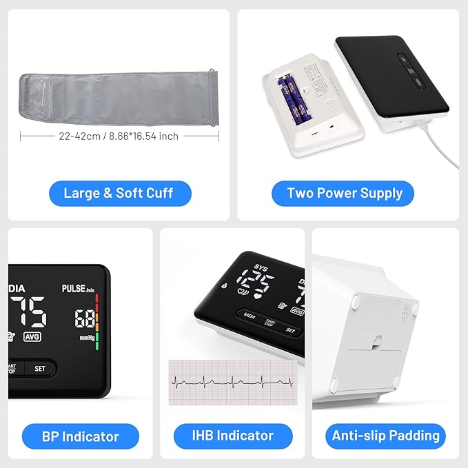- Power Saving and Anti-slip: The blood pressure machine will automatically turn off to save and extending battery life; 4 anti-slip pads ensure stable measurement and increase precision reading; What you got: 1 * BP Machine; 1 * Cuff; 4 * AAA Batteries; 1 * Type C Cable; 1 * User Manual; 1 * Quick Guide; 1 * Package Box