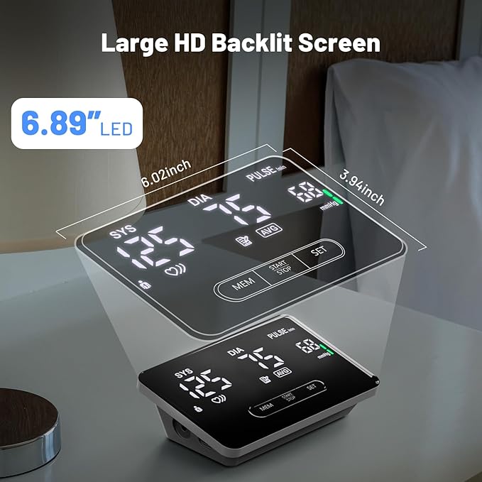 - Extra Large Backlit Display and Quiet Operation: The 6.89 inch LED display with large and white fonts make this upper arm blood pressure cuff very easy to read; The professional noise reduction technology makes the upper arm blood pressure monitor very quiet during measurement; All is user-friendly for the elderly