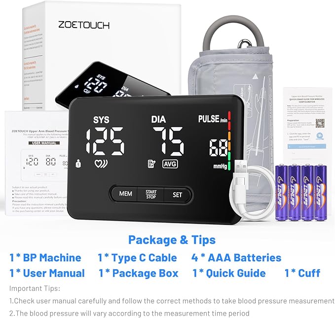 - Offline Storage for Easy Use:This wireless blood pressure monitor stores readings in machine without app connected, and transfers data to APP automatically when it’s connected, eliminating the need to connect to the ZOETOUCH Health App every time, more easy and convenient use at home