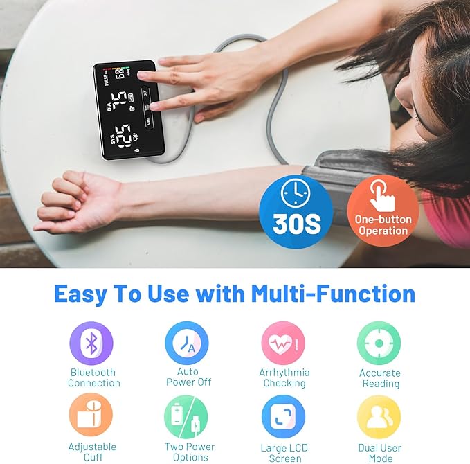 - One Button Operation with Fast Results and Add Notes: Just need to press one "START/STOP" button to measure your blood pressure and you will get the reading around 30 seconds later,you can add a measurement note to each reading via app after it’s done and help you better understand your health situation