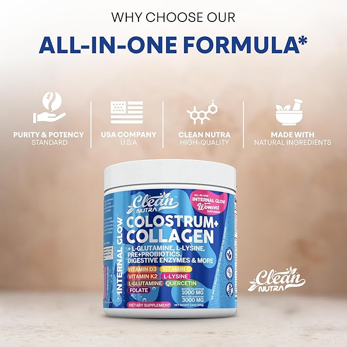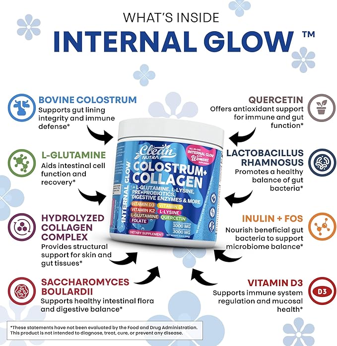 Bovine Colostrum Powder + Collagen Peptides with L-Glutamine L-Lysine Prebiotics Probiotics Digestive Enzymes Vitamin D K2 C Quercetin & Folate | Gut Health Supplement Internal Glow by Clean Nutra