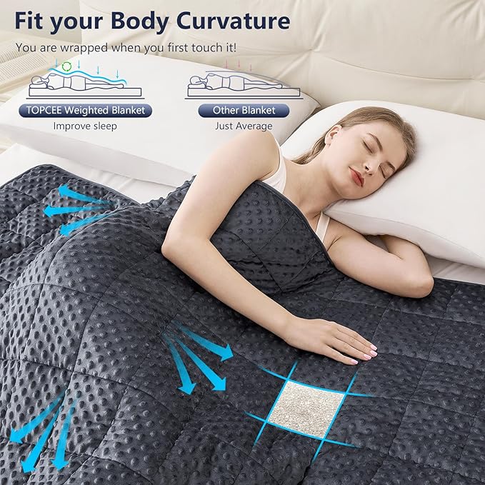 - 【Premium Material】 - Topcee weighted blanket is made of soft breathable microfiber material and filled with 0.8-1 mm non-toxic hypo-allergenic glass beads. Our weighted blanket is designed with pressure bubbles to give you an extraordinary touch experience. This blanket could providing a cooling sensation in the summer & a breathable warmth in the winter.