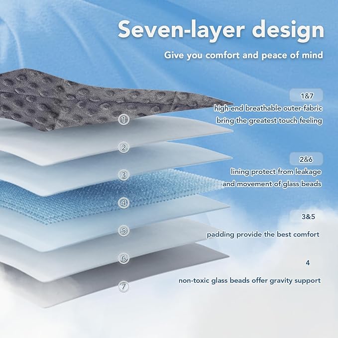 - 【Precise positioning technology of glass beads】- We have observed that for weighted blankets, the biggest problem is that as the beads move in the blanket, the weight becomes more and more uneven. To solve this problem, we designed a professional tool to fill glass beads. This tool makes the beads evenly distributed in the blanket. At the same time, we use high-strength sewing thread, which is very strong to ensure that the beads will not enter another area from one area during use of blanket.