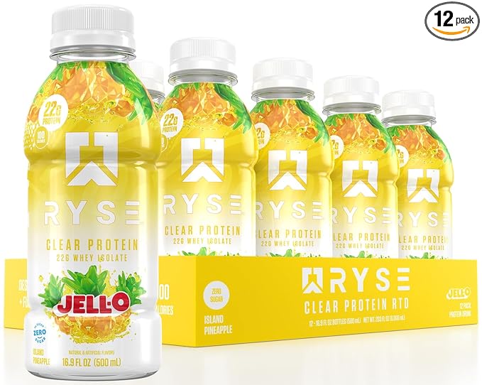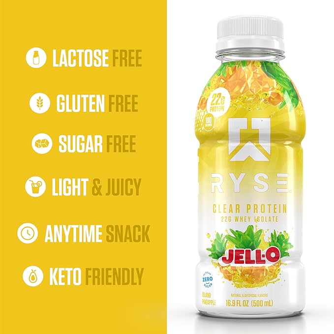 RYSE Clear Protein Shake - Jell-O Island Pineapple - 100 Calories, 22g Whey Isolate Protein, Sugar-Free, 0g Fat & Lactose-Free - Refreshing Ready-to-Drink Beverage - 16.9 fl oz Bottles (12-Pack)