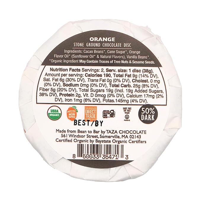 Taza Chocolate Organic Mexican-Style Disc 50% Dark Chocolate, Orange, 2.7 Ounce (12 Count), Vegan