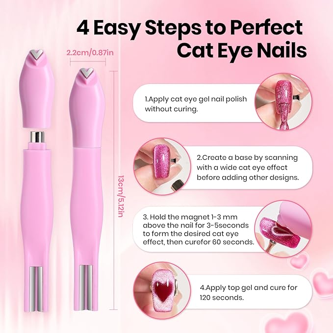 - Easy Steps to Perfect Cat Eye Nails: Simple, fast, and beginner-friendly — from start to shine! Apply your cat eye gel polish, hover the magnet 1–3 mm above the nail for 3–5 seconds, then cure. Create salon-quality cat eye nails at home in minutes.