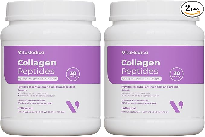 - Health and Beauty: Look great and feel great with VitaMedica's Collagen Peptides. One scoop serving per day supports healthy hair, skin, nails, bones, and joints.