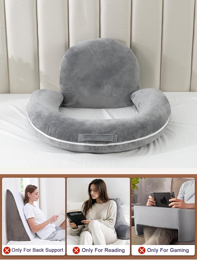 - Unique New Design. The reading pillow consists of a semi-circle and a curved shape, which are connected by only two long straps, bringing multiple functions. You can use it as a gaming pillow, a lap pillow, a back pillow for bed rest, and a wedge pillow.