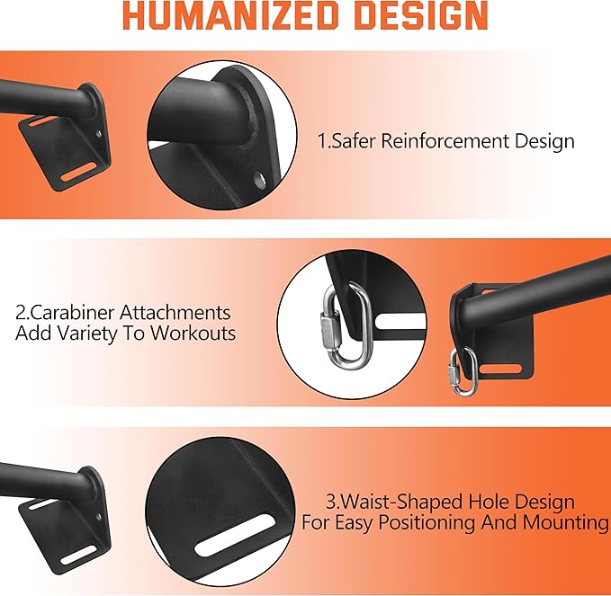- COMES WITH 2 CARABINERS:Our rogue pull up bar is designed with innovation at heart, coming equipped with two strong holes and high-quality carabiners. You can easily incorporate additional training accessories like suspension straps, training ropes or Yoga straps for a more holistic workout experience