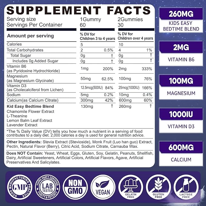 - Produced with quality in mind: Our kids sleep gummies is made in a cGMP-certified facility. These gummies are Non-GMO, sugar-free, vegan-friendly, lactose free and gelatin-free, ensuring high-quality ingredients for your kid's wellness.