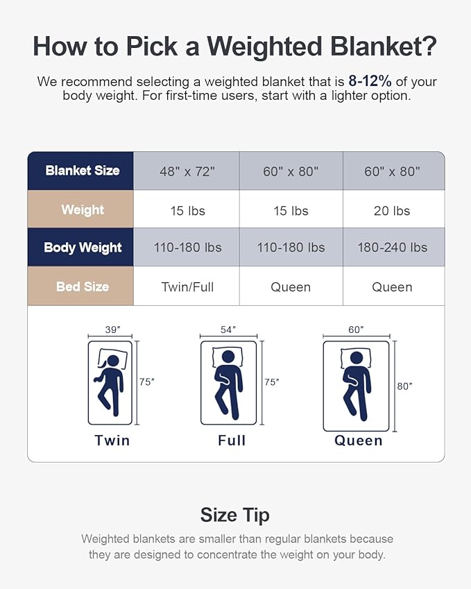 - Ideal Size For You: We recommend you choose a weighted blanket weighs about 8% - 12% your body weight. The 15 lbs weighted blanket is for adults between 110 -180 lbs, 20 lbs weighted blanket for adults over 150 lbs. In case it’s the first time you use a weighted blanket, start off with a lighter one and you will enjoy its full benefit within a week