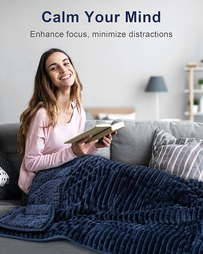 Sherpa Fleece Adult Weighted Blanket with Ribbed Stripes, 15 Pounds Dual Sided Soft Plush Blanket for Couch Bed Sofa, Heavy Thick Blankets with Ceramic Beads Great for Sleep, Navy Blue, 48" x 72"
