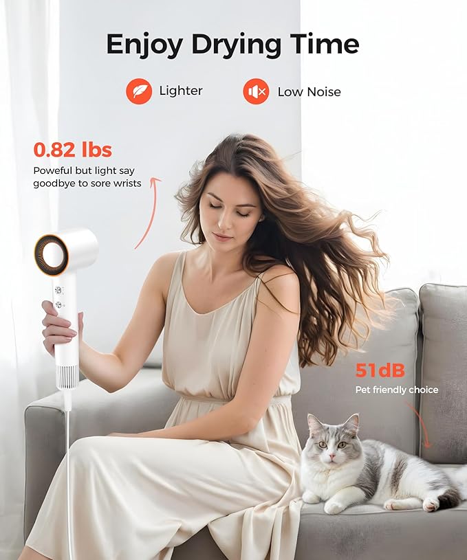 - Low Noise & High Safety: The hair blow dryer features a streamlined body and precisely designed airflow channels that work together to keep the noise level as low as 51 dB, allowing you to style your hair with confidence, anytime and anywhere. The safety plug provides superior protection. Easily create a variety of hairstyles